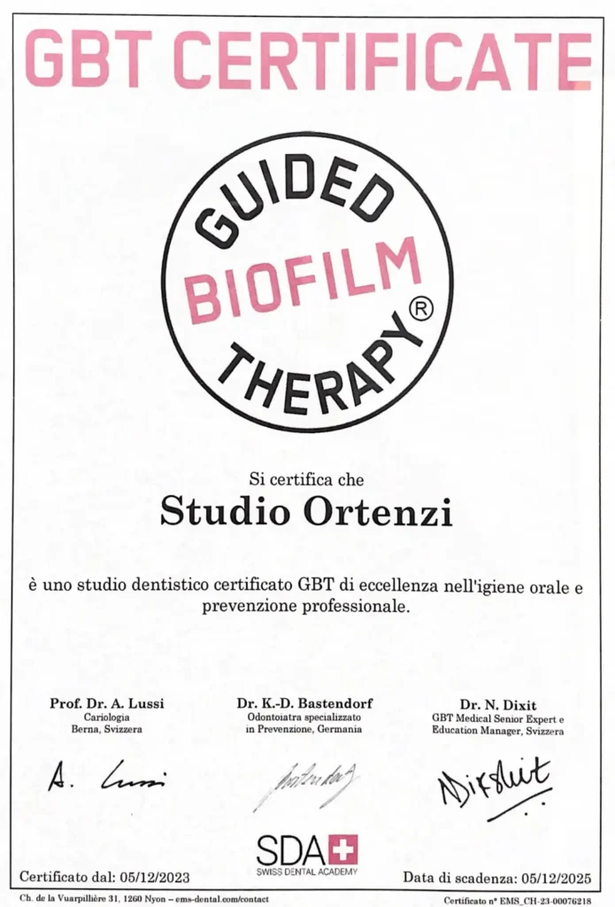 La nostra Clinica Odontoiatrica Ortenzi è certificata GBT di eccellenza nell’igiene orale e prevenzione professionale grazie ai nostri corsi e ai nostri strumenti professionali.